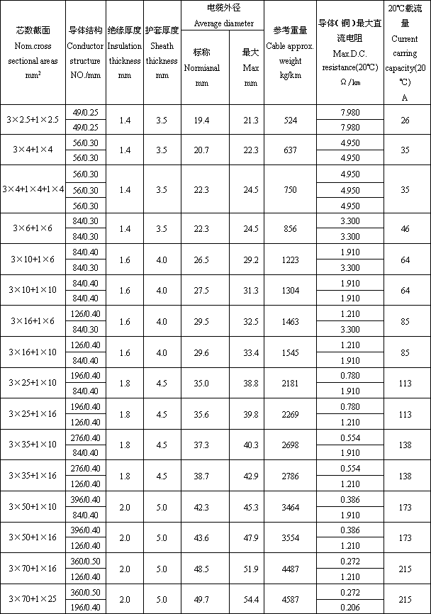 型號(Type):MY 額定電壓(Rating Voltage):380/660V芯數截面 Nom.cross sectional areas mm2導體結構 Conductor structure NO./mmJ緣厚度 Insulation thickness mm護套厚度 Sheath thickness mm電纜外徑 Average diameter參考重量 Cable approx. weight kg/km導體(銅)大直流電阻 Max.D.C. resistance(20 ℃ ) Ω /km20 ℃載流量 Current carring capacity(20 ℃ ) A標稱 Normianal mm大 Max mm3 × 4+1 × 456/0.301.43.520.923.06374.9503556/0.304.9503 × 6+1 × 684/0.301.43.522.925.18563.3004684/0.303.3003 × 10+1 × 1084/0.401.64.027.830.613041.9106484/0.401.9103 × 16+1 × 10126/0.401.64.030.333.315451.2108584/0.401.9103 × 25+1 × 16196/0.401.84.536.440.122690.780113126/0.401.2103 × 35+1 × 16276/0.401.84.540.544.627860.554138126/0.401.2103 × 50+1 × 16396/0.402.05.045.550.135540.386173126/0.401.2103 × 70+1 × 25360/0.502.05.051.555.145870.272215196/0.400.780