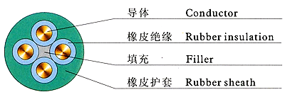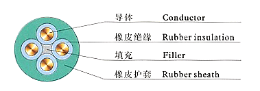 3、U型電纜有4芯和5芯兩種結構,有3根主線芯和一根地線芯組成(5芯電纜中有一芯為控制線),圍繞墊芯絞合成纜,外面擠包氯化聚乙烯橡皮護套或黑色氯丁橡皮護套。